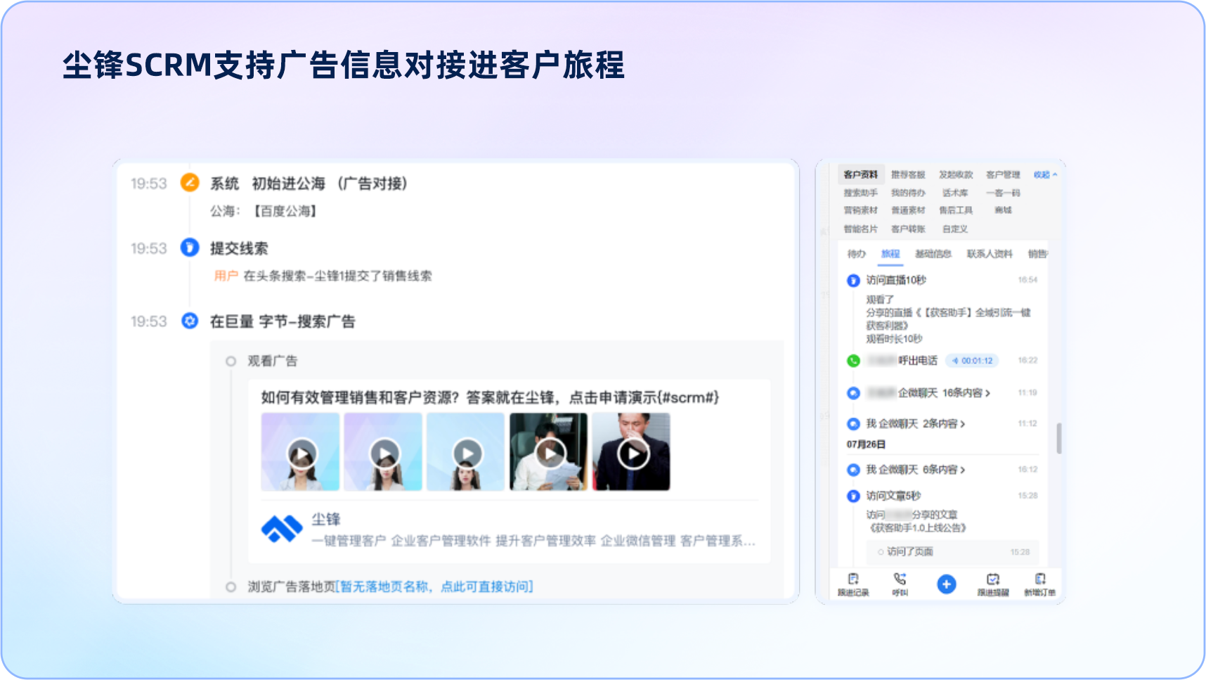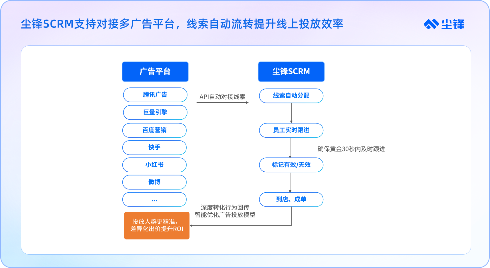 现在,企业可以借助尘锋SCRM更直接的完成线索对接-跟进回传,不仅能够自动把线索从广告平台接进系统,让销售更快建联,还可以把线索的跟进结果回传给广告平台,在下次投放时帮助企业更精准的找到潜在客户,把营销内容真正推给有需要的人。