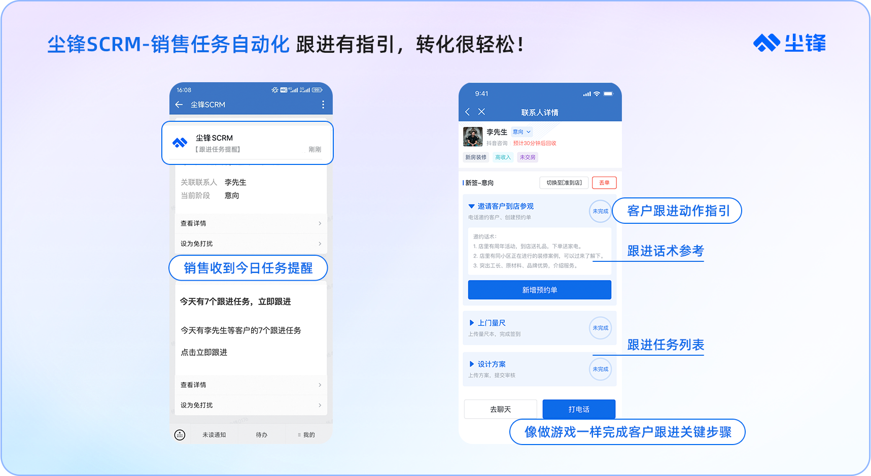 现在,在新线索进线时,在尘锋SCRM的帮助下,不仅会提醒销售及时跟进新线索,还可以为销售提供跟进动作指引,确保销售完成标准化的跟进沟通,及时有效地挖掘客户需求。