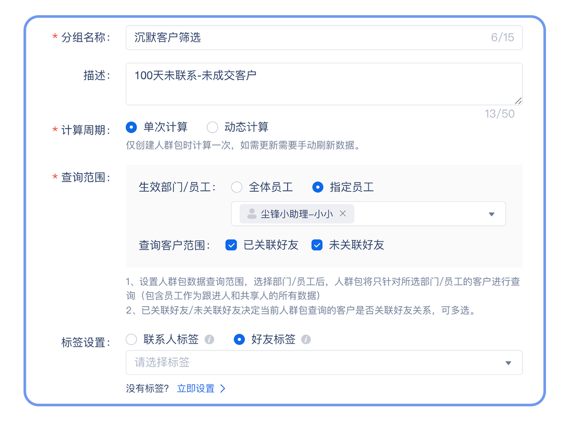 现在,您可以借助尘锋SCRM的人群分组能力,实现快速、精准的客户筛选。