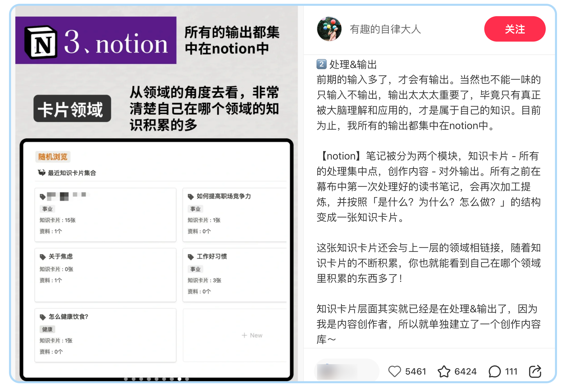 Notion支持通过知识卡片快速集中处理内容,可以将知识信息从Flomo和幕布同步至Notion,并利用知识卡片能力快速整理为个人数据库,实现个人知识库的积累和复用。
