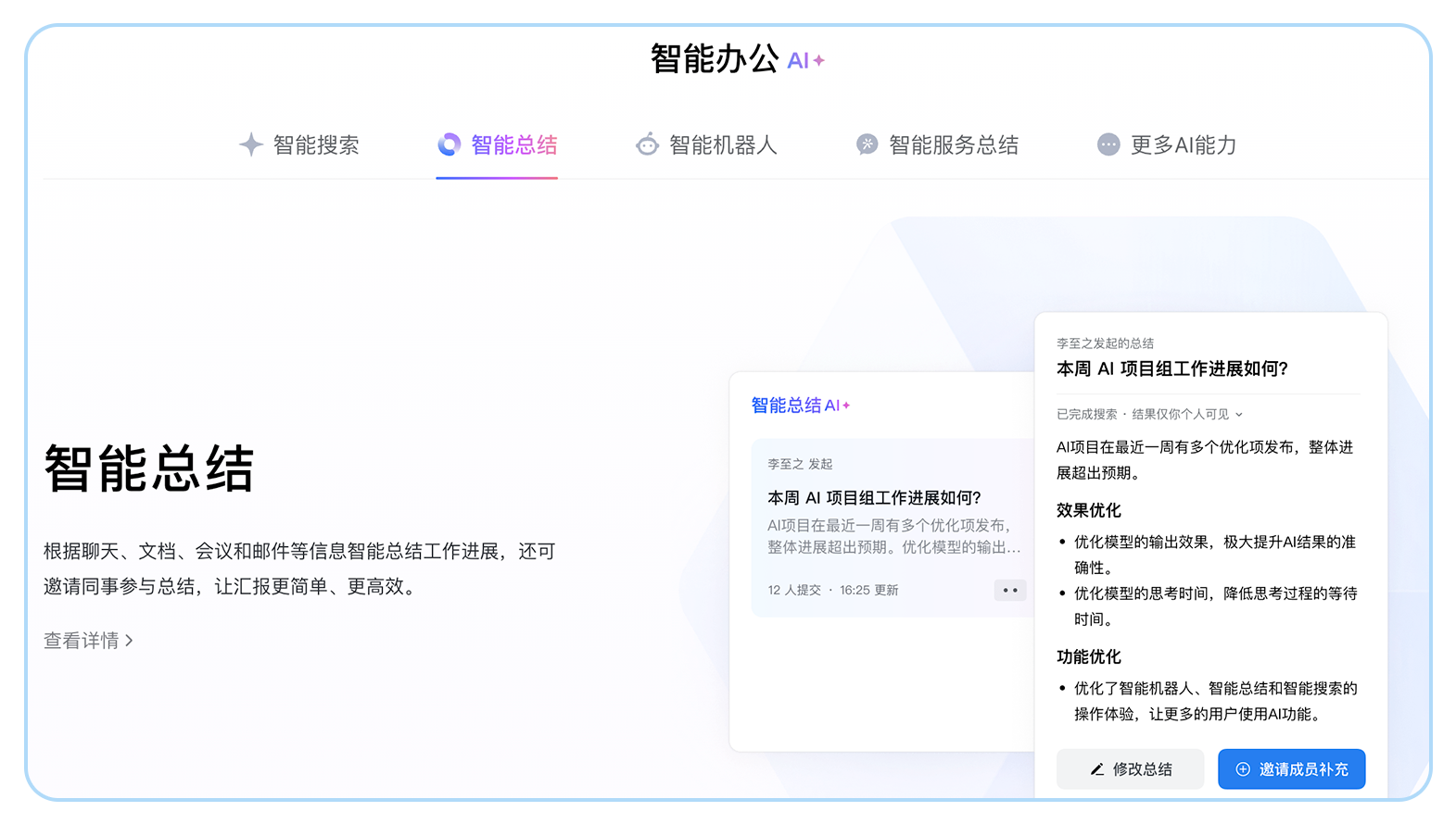 8月,企业微信发布了新5.0版本,支持智能搜索、智能总结、智能机器人等功能,不仅能够帮助企业整合聊天/会议记录/文档等业务资料,还可以提升在AI的帮助下,提高业务汇报、日常办公效率。