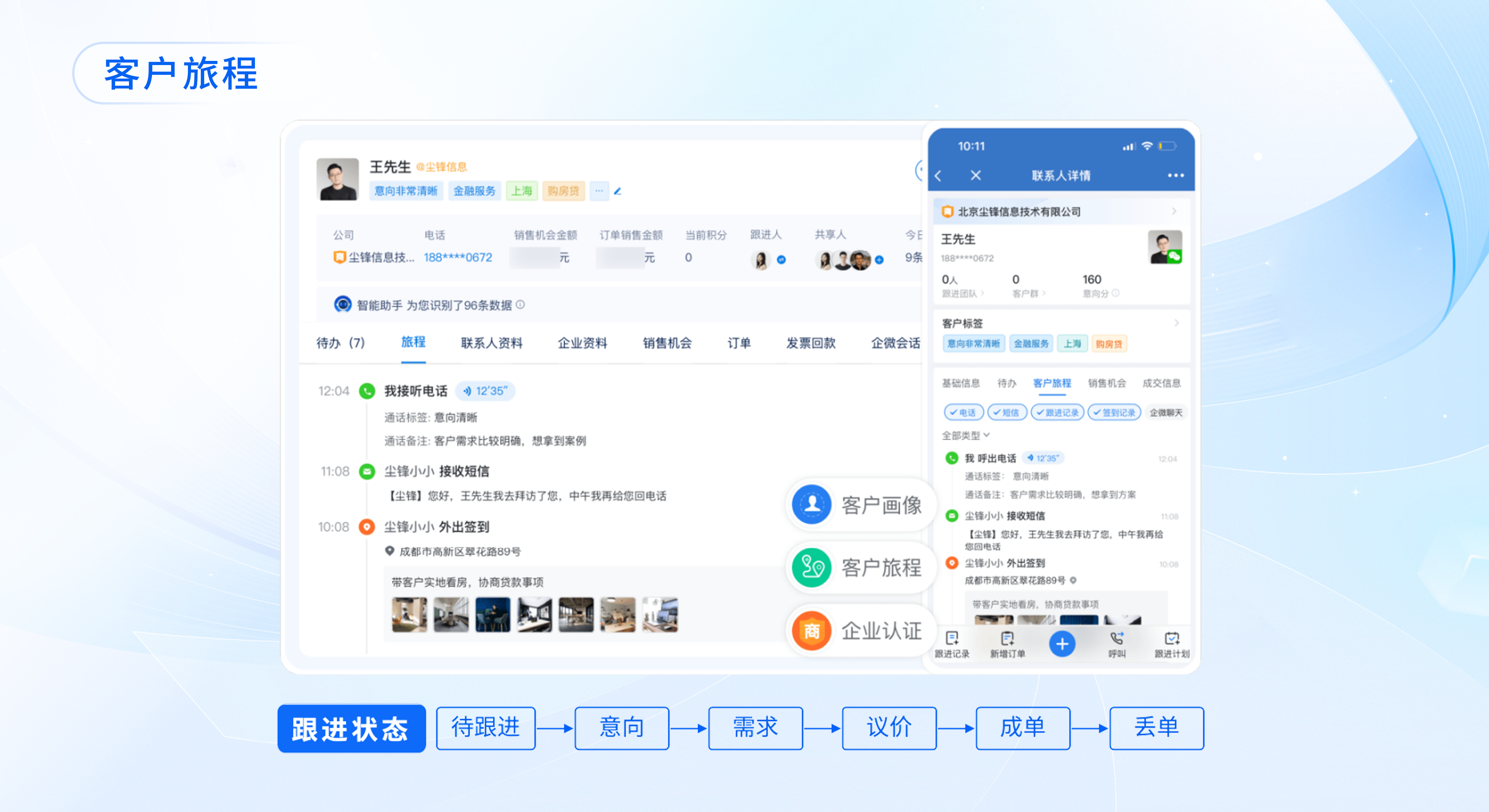 比如,AI可以学习优秀工作话术和工作习惯。企业可以借助尘锋SCRM,通过会话存档、客户旅程等功能,全程记录优秀销冠的跟进话术和沟通过程,在客户跟进上,销冠会使用什么样的开场白?如何应对客户的拒绝?什么节点会跟进客户?在什么时机、采用什么方式询问客户需求?如何建立信任、用个性化语言拉近关系?