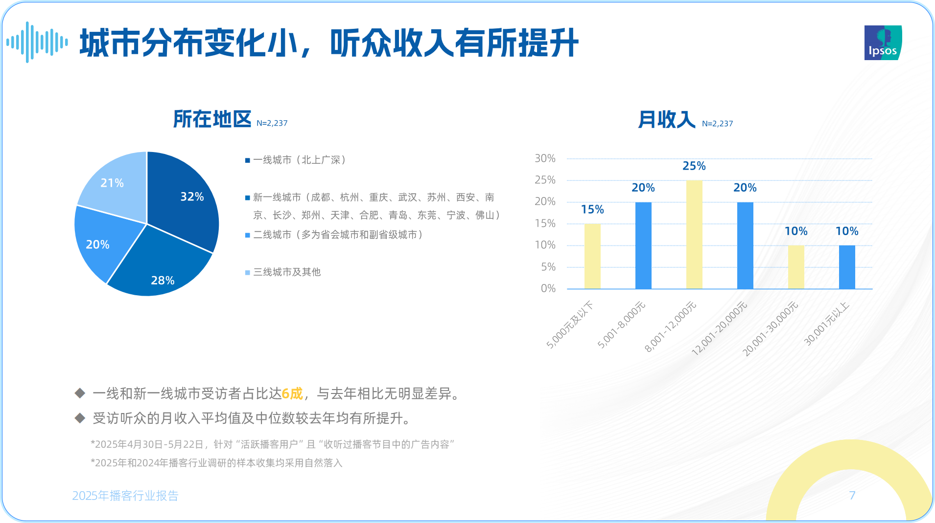 根据益普索发布的《声入人心:2025年播客行业报告》,播客的主要受众62%为25-40岁人群,典型身份包括中产、白领、企业主、公务员等,属于高价值用户群体。他们不仅对播客栏目和主播表现出高认可度,也具有高粘性、高留存等特征。