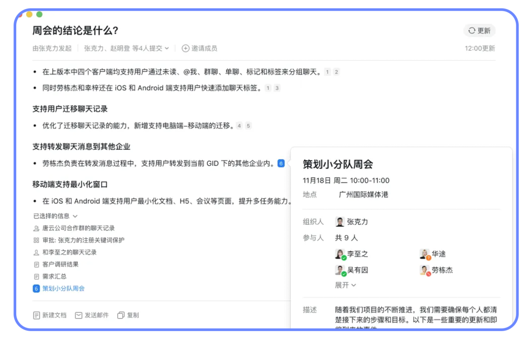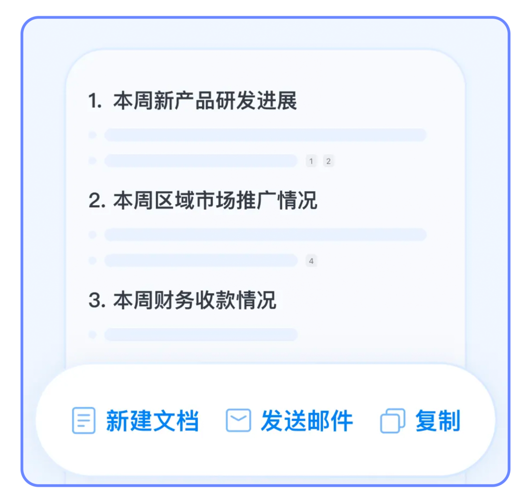 如果员工需要向上汇报AI总结的内容,也可以直接把智能总结、智能搜索生成的内容直接复制,或者一键新建文档、发送邮件,如果需要编辑,也可以直接上手修改,使用起来更方便。