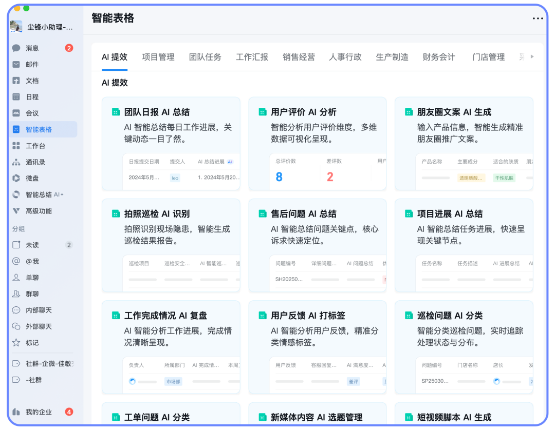 现在,信息处理变便捷了,员工无需翻查几十上百个会话窗口,AI可直接摘取并总结关键内容。数据整理变轻松了,智能表格让员工从低价值、高重复的“数据搬运”中解放,也让管理者能实时、准确地看到真实的业务全景。