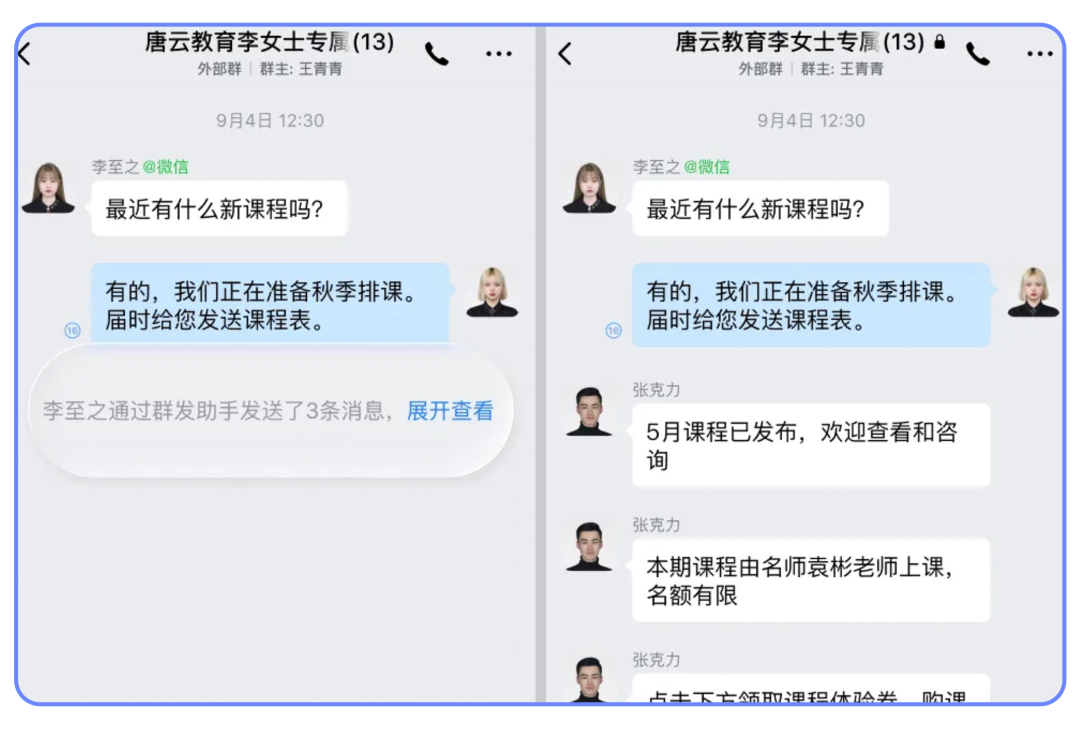 本次更新后,群内同事发布的营销内容、欢迎语等内部消息,将不再打扰至其他同事,该群聊也不会浮动到会话列表最新位置。只有当客户提出新问题或出现需处理的消息时,才会更新到会话列表前列。