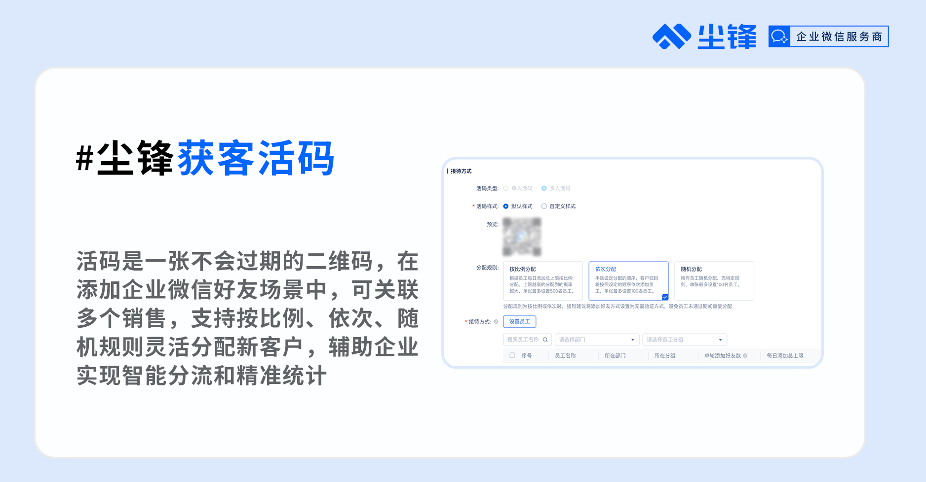 现在,在尘锋SCRM的帮助下,销售可以借助活码能力添加客户,加上好友后会自动向客户发送配置好的活动相关欢迎语,在活动进行时辅助销售沟通;系统中也会准确记录客户的来源渠道信息,销售后续可以基于客户的意向程度、加粉来源等筛选项精准查找潜在客户,辅助销售沟通转化。