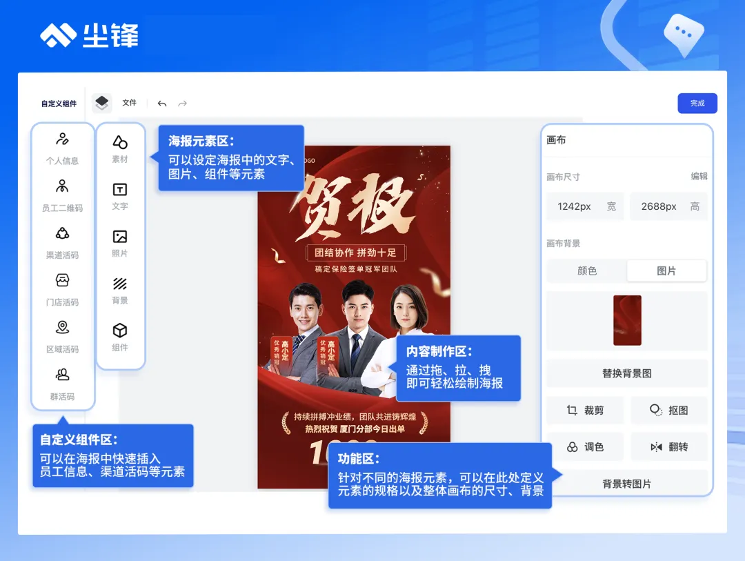 首先,为销售提供易用的内容与工具支持,降低营销素材的制作门槛。 比如,企业可以通过尘锋SCRM,为销售团队提供丰富的营销素材库,一线人员也可以借助托拉拽等操作简单完成营销物料制作,配合热点营销日历、一键生成短链和获客活码等功能,帮助销售轻松制作和分享真实、有价值的内容,满足企业获客需要。