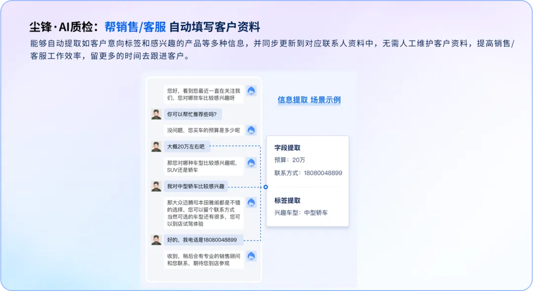 其次,管理者要在合适的场景合理运用AI,减负销售。比如,管理者可以为一线员工借助尘锋SCRM的AI自动打标签、自动撰写跟进记录等功能,减负销售,让销售有时间、有精力专注与客户沟通,提升客户的服务体验。