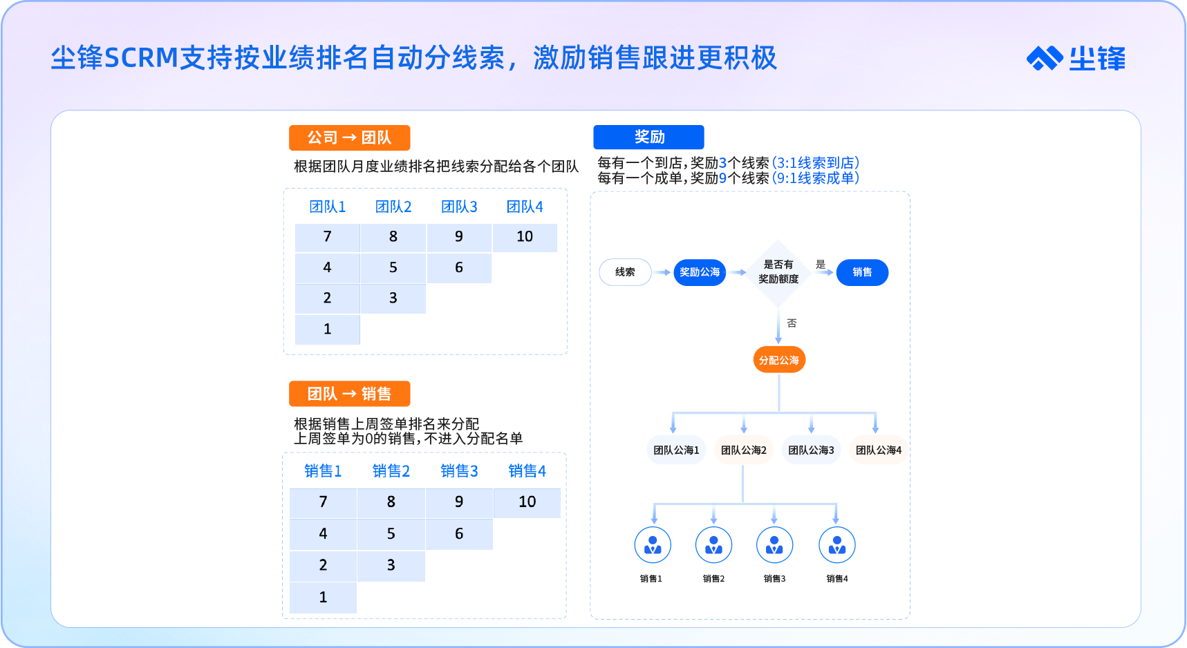 同时,尘锋SCRM支持将线索按地域、部门、销售业绩排名等规则,自动分配给对应销售跟进,确保线索分配合理、高效。