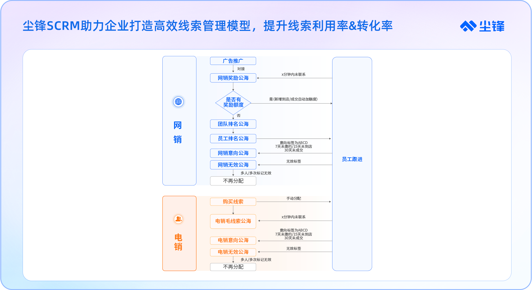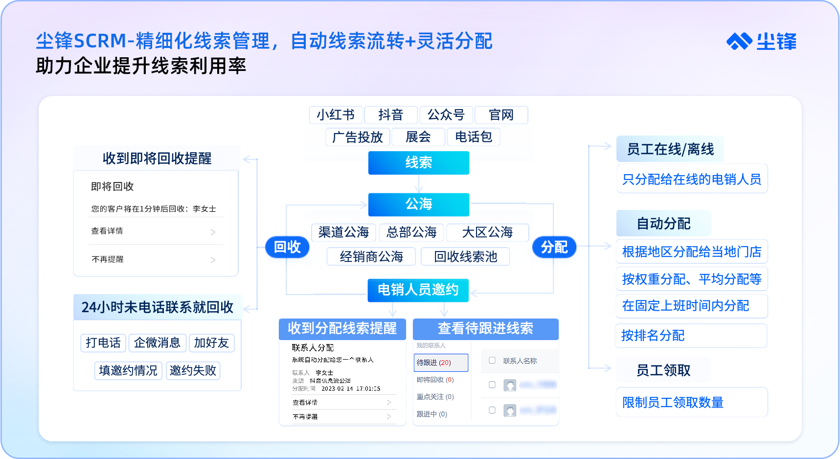针对线索对接慢、分配乱、跟进不及时的问题,尘锋SCRM可自动对接广告平台,实现线索全流程自动化管理,确保每一条线索都能被及时跟进。