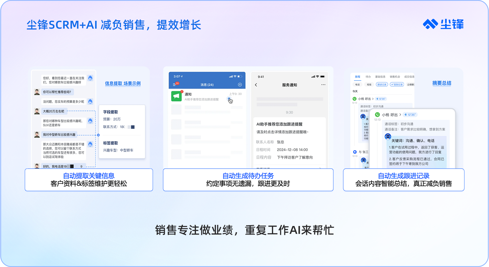 针对销售重复性工作多、效率低的问题,尘锋SCRM已接入AI能力,可以真正实现销售减负,让销售专注于客户沟通,提升跟进效率。